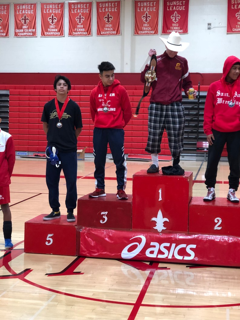 Next at 126 pounds Sanger Freshman Fernando Gonzalez took on Jaime Dewing of Capistrano Valley for his first match of the tournament. Gonzalez pins Dewing midway through the first period and advanced to the quarterfinals to take on Segerstrom’s Saeed Perez. Gonzalez would pin Perez midway through the first period advancing him to the semifinals to take on Newberry Park’s Kevin Kilbane. Gonzalez would dominate the match for a 9-2 victory. Gonzalez would advance to the finals to take on Jose Mata of Santa Ana High School. Gonzalez would come up short as Mata get the pin late in the second period. Gonzalez would bring home the silver medal.