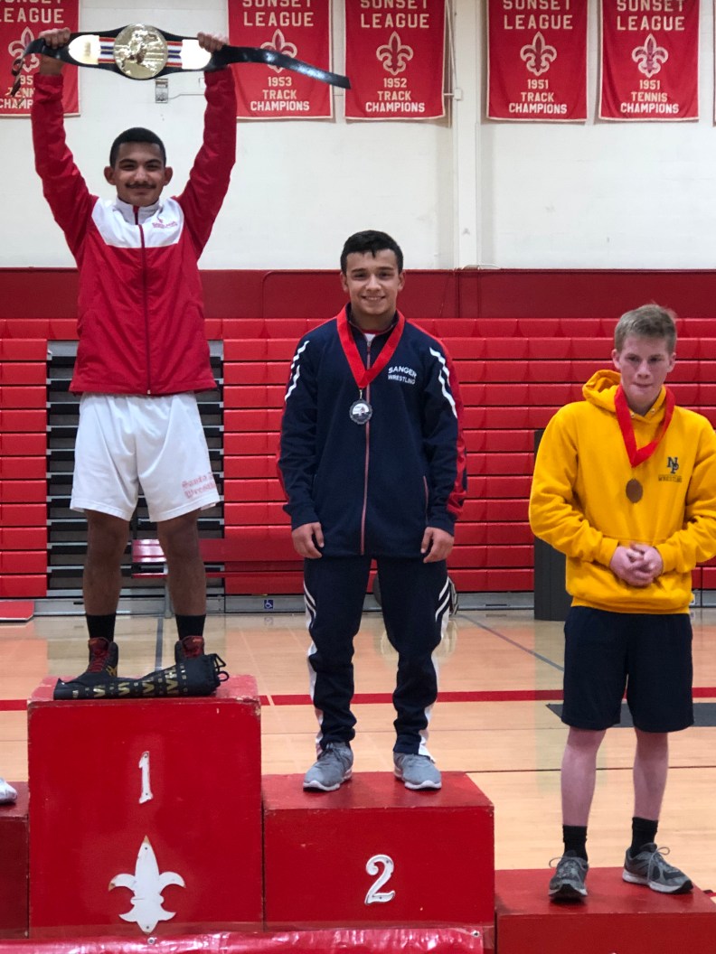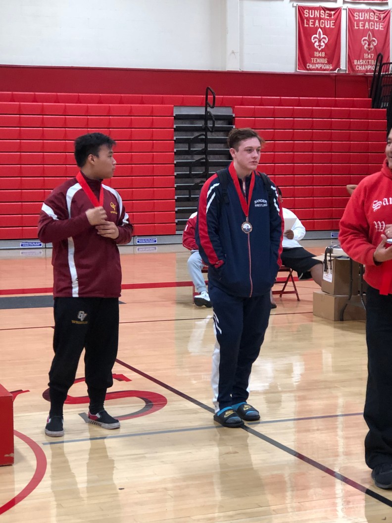 Sanger 113 pounder Christian Gonzales (SO) took on Kiren Naicker of Trabuco Hills for his first match of the day. Gonzales would pin Naicker and advance on to the semifinals where he took on Nathan Muniz of Hilcrest High School. Muniz ends up getting the fall at the end of the second period putting Gonzales in the Consolation semifinals. Next Gonzales took on Andrew Rodriguez of Canyon High School. Gonzales goes on to pin Rodriguez late in the first period advancing him to the 3rd and 4th Place match. Gonzales took on Cameron Glabb of Costa Mess. Gonzales pins Cameron Glabb to take home the bronze medal.