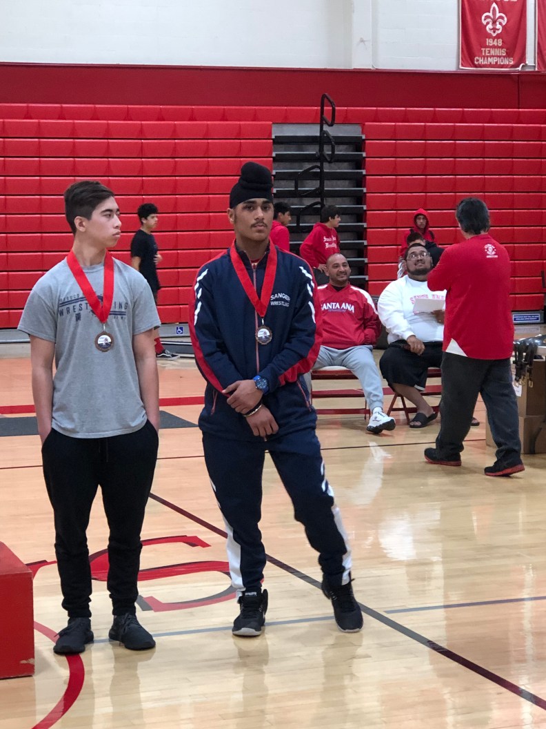 At 132 pounds Sanger Freshman Randeep Singh took on Alex Ruiz of Newberry park for his first match of the day. Singh dominates the match picking up the major decision 9-0 advancing him to the quarterfinals. Singh would next take on Jospeh Cervantes of Santa Ana. Singh battles tough but Cervantes would take a 11-2 victory. Singh dropped to the Consolation bracket putting him up against Ode Patino of Santa Ana. Singh pins Patino in :39 seconds advancing him to Consolation semifinals to take on Mason Santos of Canyon. Singh battles tough but comes up short 9-1 and would drop to wrestle for the 7th and 8th Place Medal. Singh took on Capistrano Valley’s Colin young. Young would come out on top defeating Singh 7-4. Singh takes home the 8th place medal.
