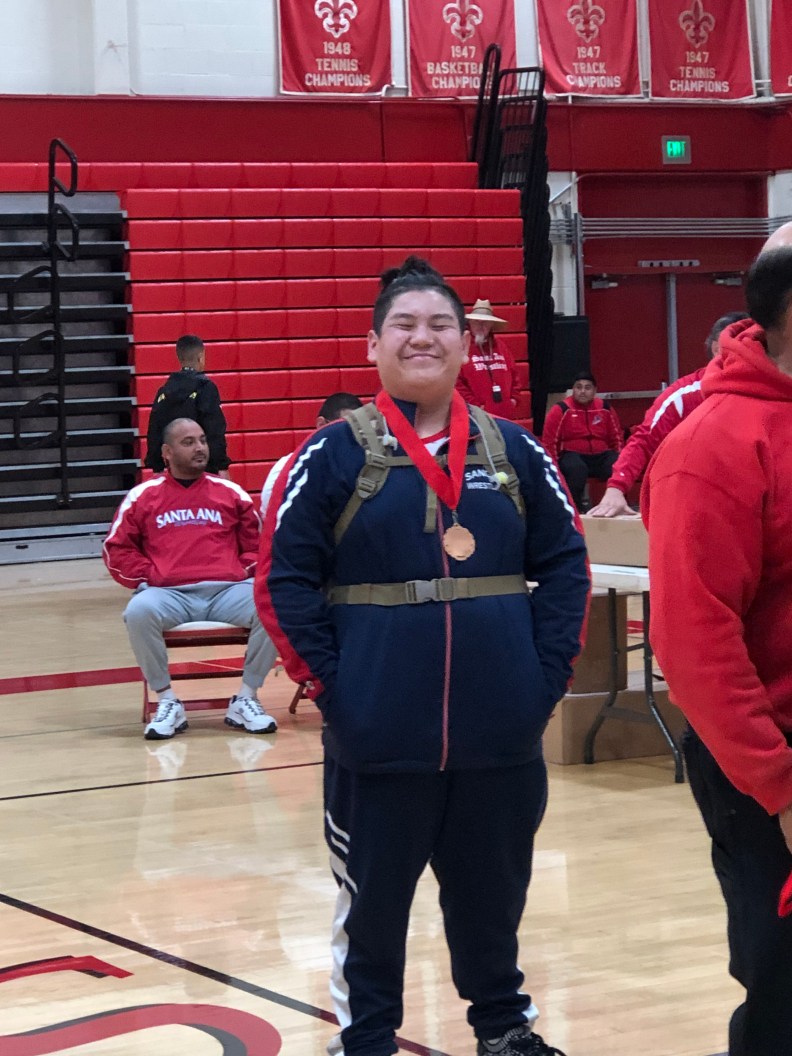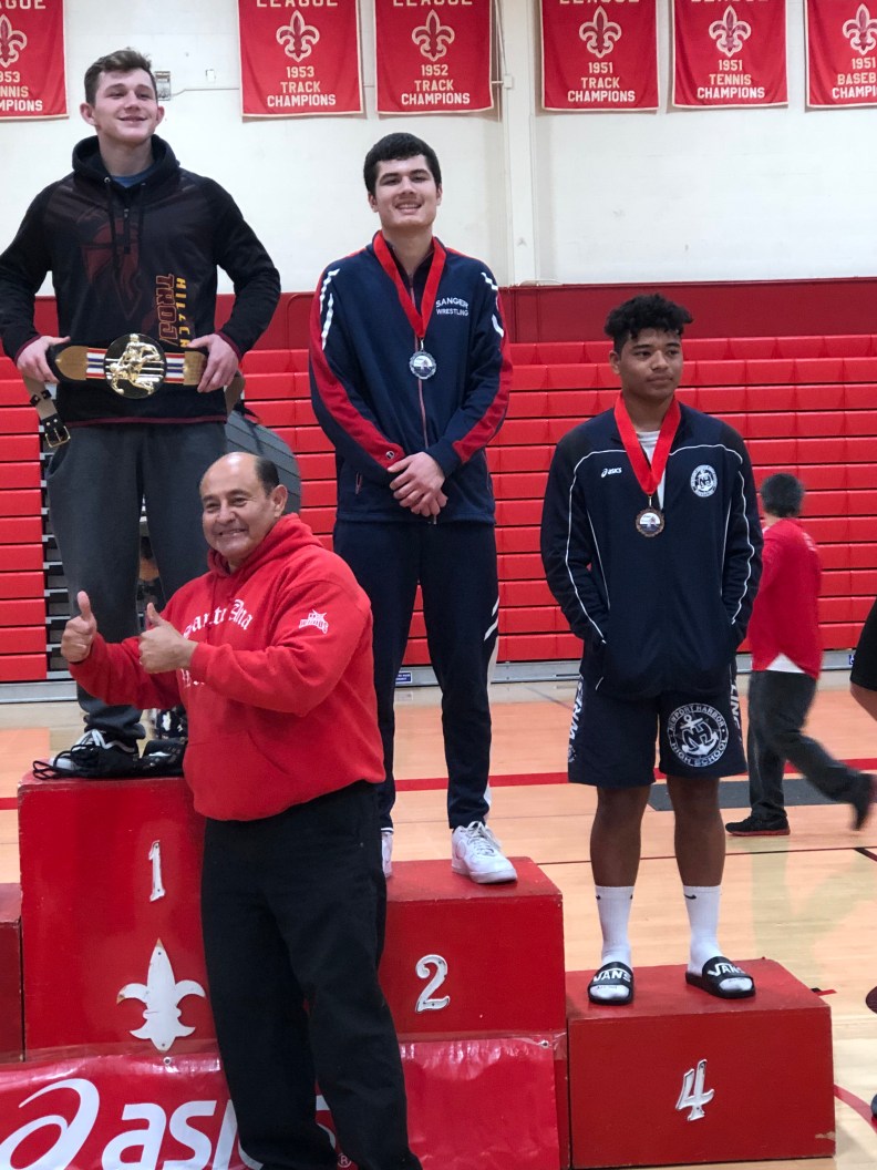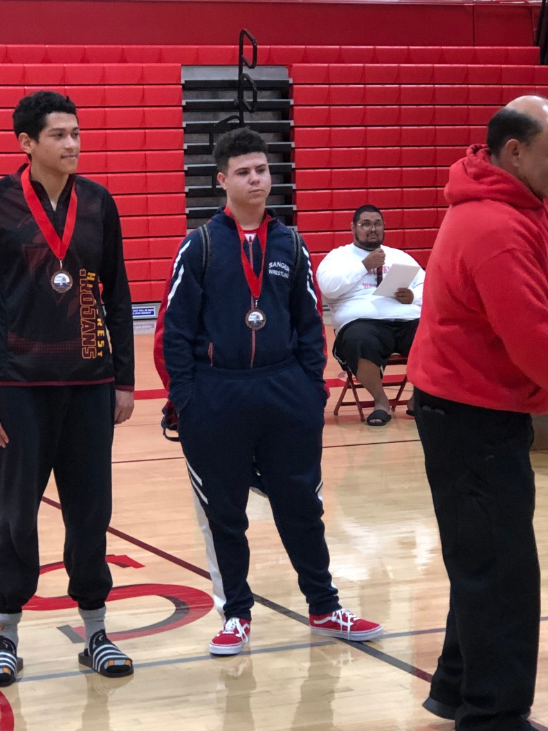 Freshman HWT Tomas Takeda took on Michael Boudreau first match and picked up the pin advancing him to the quarterfinals to take on Jospeh Dalilis of El Toro. Dalilis picks up the pin dropping Takeda to the Consolation bracket to take on Sanger’s own Bryson Davis picking up the fall in the last seconds of the 3rd period. Takeda moved on to wrestle Jorden Benton of Villa Park. Benton would pick up the pin dropping Takeda to the 7th and 8th Place match to take on Daniel Ramos of El Toro. Ramos picks up the victory 4-2 and Takeda takes home the 8th place medal.