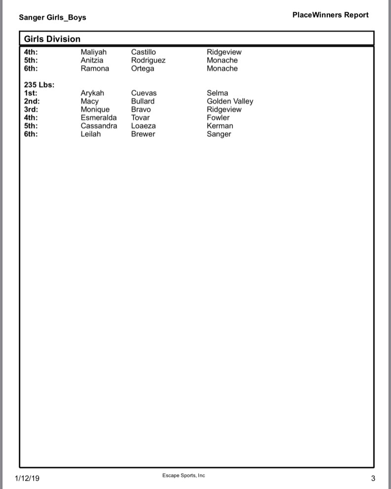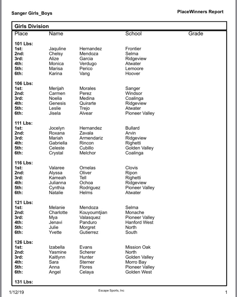 Sanger Sophomore at HWT Leilah Brewer made her season debut. Brewer faces Valencia of Pioneer Valley first round. Brewer picked up the Fall in :26 seconds. Next Brewer took on Bravo of Ridgeview. Bravo would pick up the decision 8-2 dropping Brewer to the Consolation bracket to take on Flores of Golden Valley. Brewer would pick up the pin in 2 min and 42 seconds advancing her to Consolation semifinals to take on Delgado of Fowler advancing her to the 5th and 6th Place match to take on Loaeza of Kerman. Loaeza would pick up the Fall in the 1st period. Brewer would take the 6th place medal.